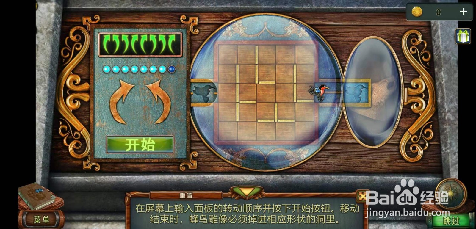 6、用钥匙打开船舱里面的大箱子,再把蜂鸟雕像放入左边凹槽,开启蜂鸟过河游戏,通过转动中间的方格,让蜂鸟顺利通过河流,如图所示即可得到野猪雕像。
