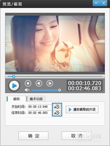 或在添加视频时,弹出的“预览/截取”对话框中,使用带左箭头的拾取小按钮,截取视频。