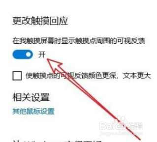 3、 3.接下来在这个光标和指针大小的设置界面,我们可以看到有更改触摸回应这个模块,然后需要点击它下方的开关将这个功能开启。