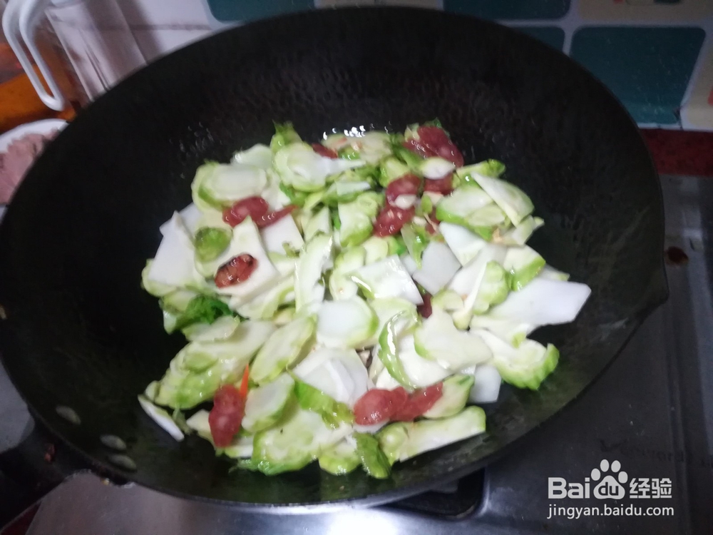 4、把腊肠倒入小火炒