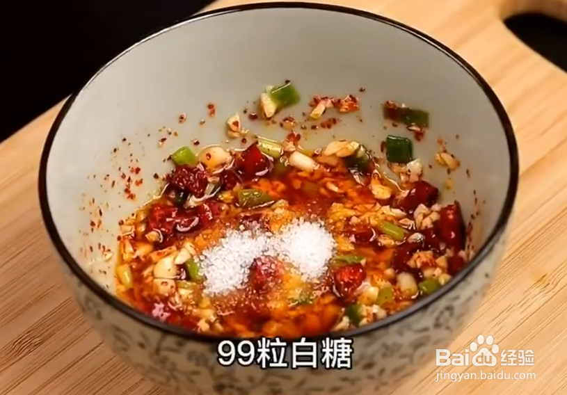 5、然后在调料碗中加入热油,激发香味,搅拌均匀。再加入一勺食盐,一勺白糖,再加入一勺生抽和两勺陈醋,继续搅拌均匀,