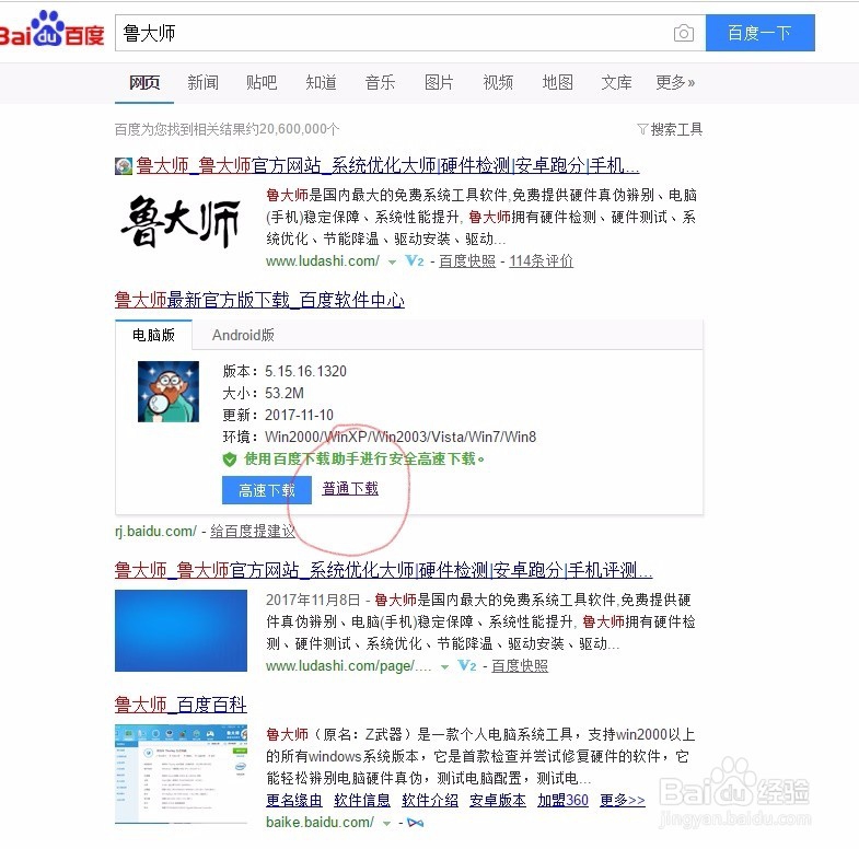 1、百度搜索关键字:鲁大师,点击下载安装