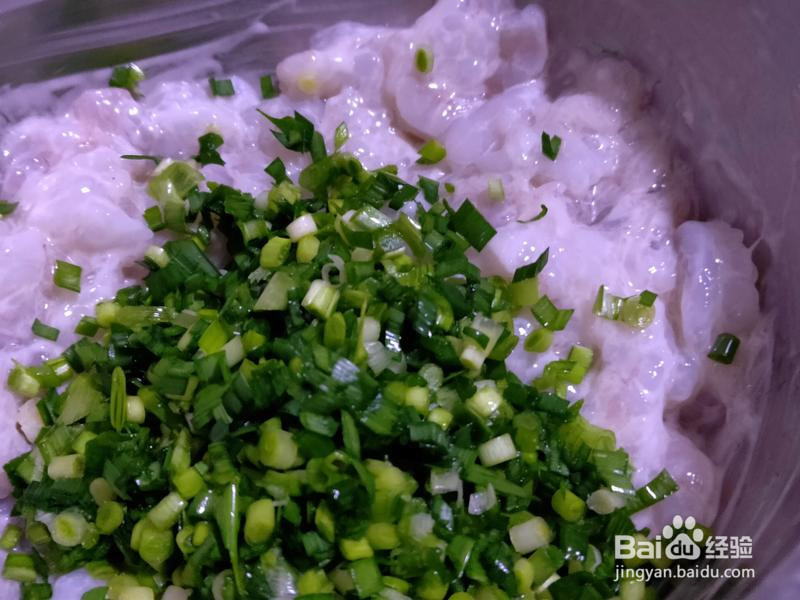 3、新鲜的小蒜苗加一根小葱,细切 加入少许食盐搅匀