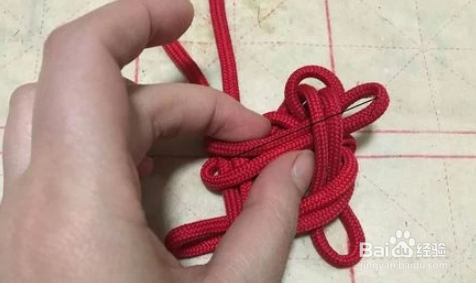 1、首先我们取一条红色绳子,最好是比较硬一点的绳子。将绳子对折,然后像下图所示的摆放。
