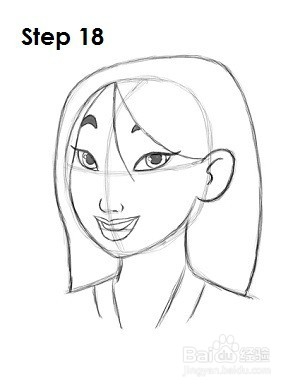 17、第17步:使组成木兰的脖子和肩膀的线变暗。在每个肩膀下方绘制几条垂直线,以代表她大衣的上半部分。