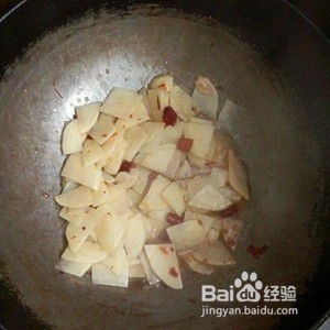 6、加入土豆翻炒均匀,加入滑炒好的肉片,加入酱油,盐鸡精少许