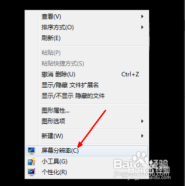 1、win7系统来示范一下,鼠标右键在空白按下,点击屏幕分辨率。