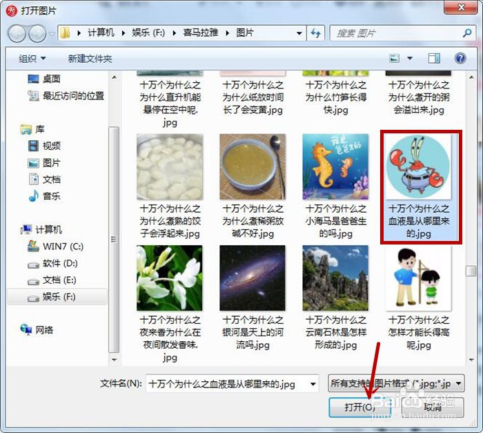 3、弹出打开图片对话框,从本地电脑中选中一张图片,然后鼠标点击打开按钮