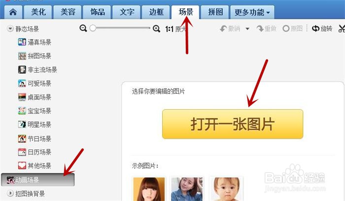 2、软件自动跳转到场景界面,默认选中的是动画场景,鼠标点击中间的打开一张图片黄色按钮