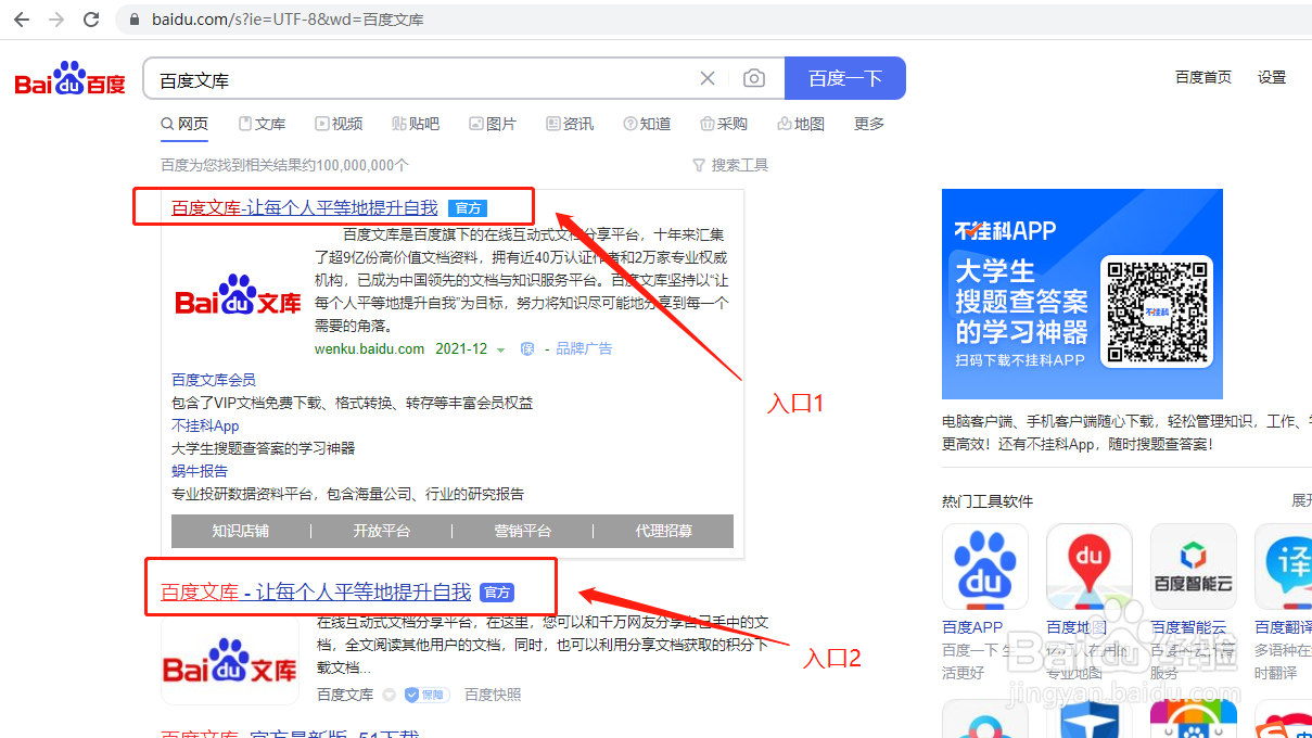 浏览器搜索百度文库,点击有显示官方标志链接进入官网。
