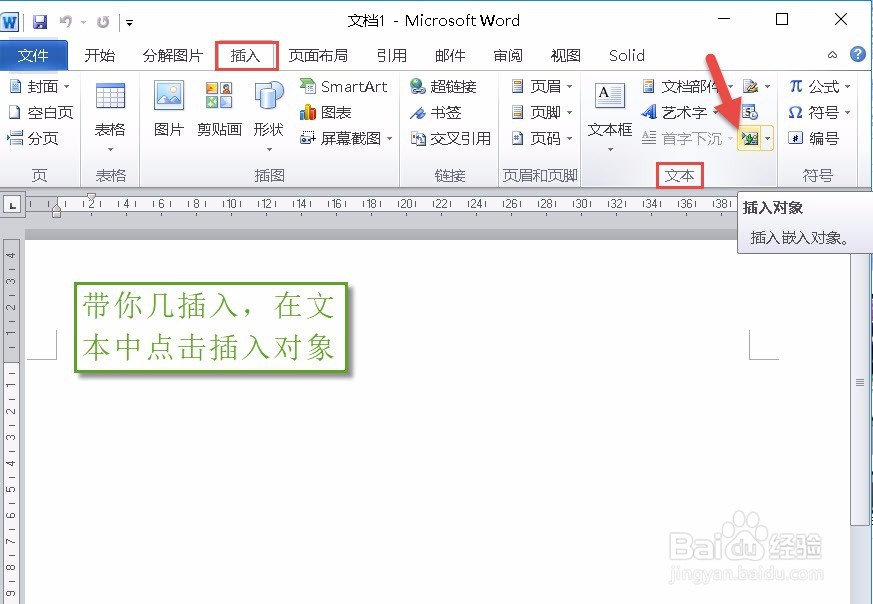 2、操作二:点击进入插入选项卡,在文本中点击选择对象,点击对象选项卡,操作图片步骤如下。