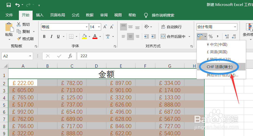 1、在excel中如何将数字设置为法郎单位?第一步,打开相关的工作表,进入相关的数字区域,准备操作。