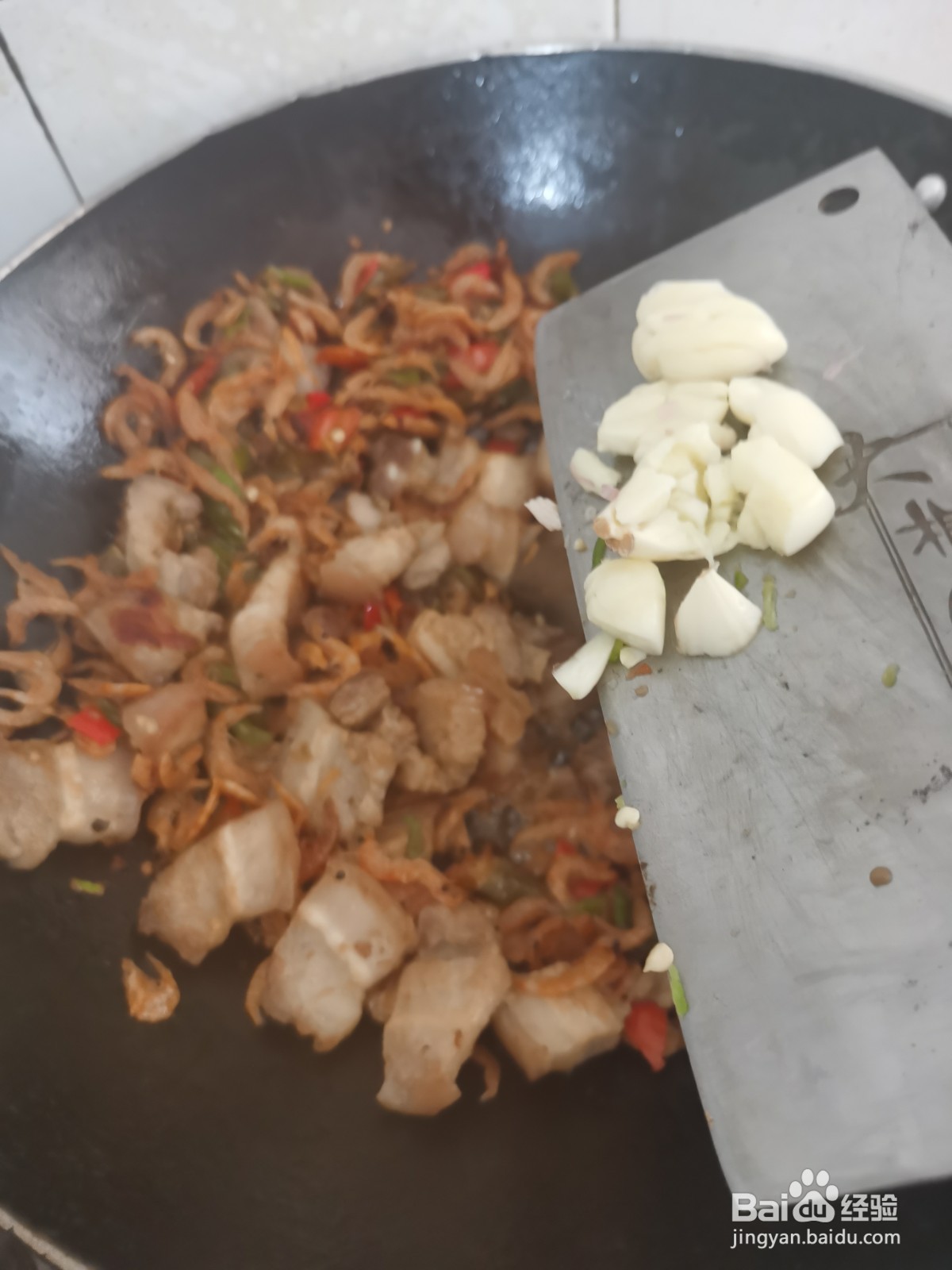 5、五花肉与虾米煮炒入味后,拍入蒜米拌炒一定时间就OK了。