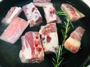1、排骨选半肥瘦的,洗净控干水分冷水放肉与水同煮。加入一根迷迭香去腥。如果没有迷迭香,放一根葱也可以的。