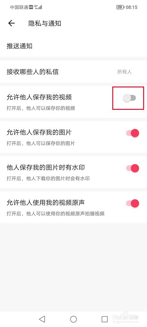 4、第四步进去隐私与通知界面之后,点击关闭允许他人保存我的视频