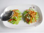 把苦瓜捞出稍微控干水分,摆入盘中,再放上红椒和葱白。