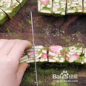 4、倒入55g抹茶奶粉,搅拌到奶粉完全融入棉花糖中。将搅拌好的糖糊尽量铺满锅,方便更均匀地裹住坚果饼干。