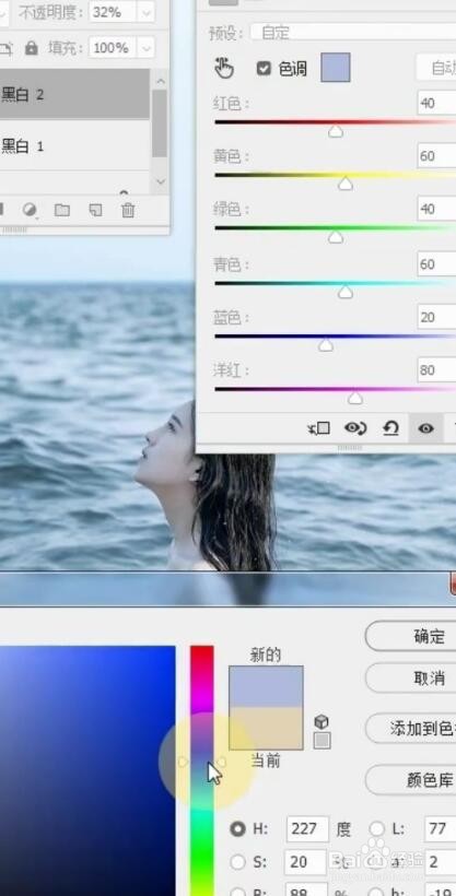 3、最后我们创建一个黑白命令,勾选色调,降低不透明度,再控制颜色的属性,就可以轻松地改变画面的色调了