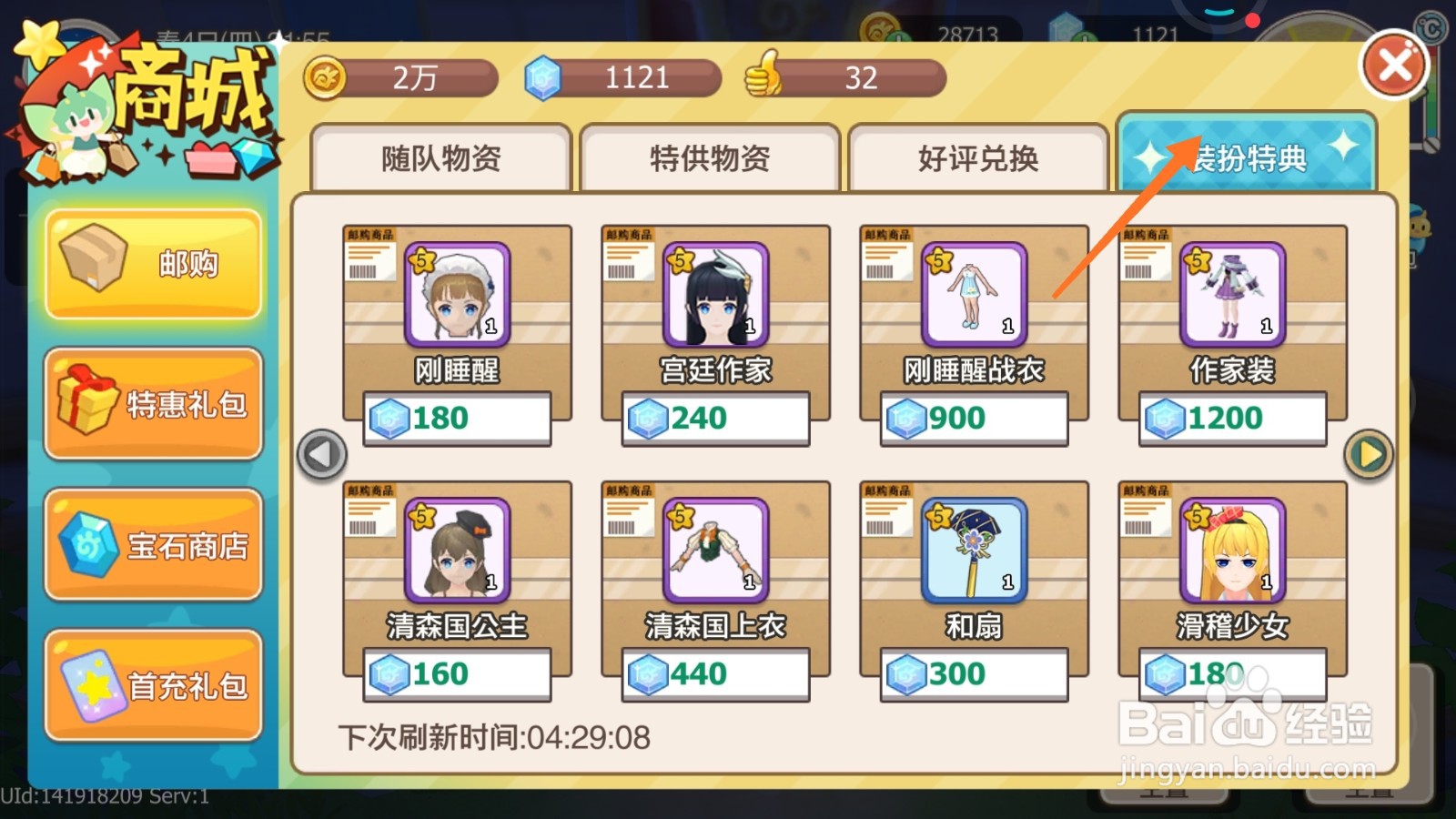 2、在打开的商城页面,点击上方的装扮特典。