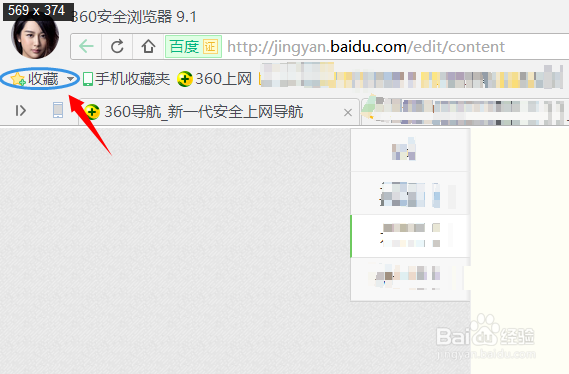 ①此方法和浏览器略有关系,不过区别并不大;无狠芬薪论是哪个浏览器,我们找到工拒轿具栏的"收藏"选项,下图是360浏览器的收藏位置
