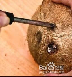 2、找到叶子的罩门——叶子一头有三个柔软的眼睛。可以用十字螺丝刀钻过去。如果不行,拿一把锤子和一支长钉子,在这些眼上开个洞,100how提示:要确保椰子不会滑来滑去,不然可能伤到自己。