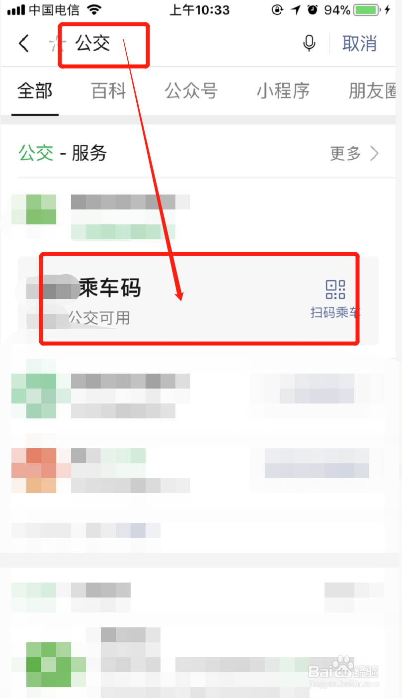 4、在搜索框中输入公交,在搜索结果中找到当地乘车码;