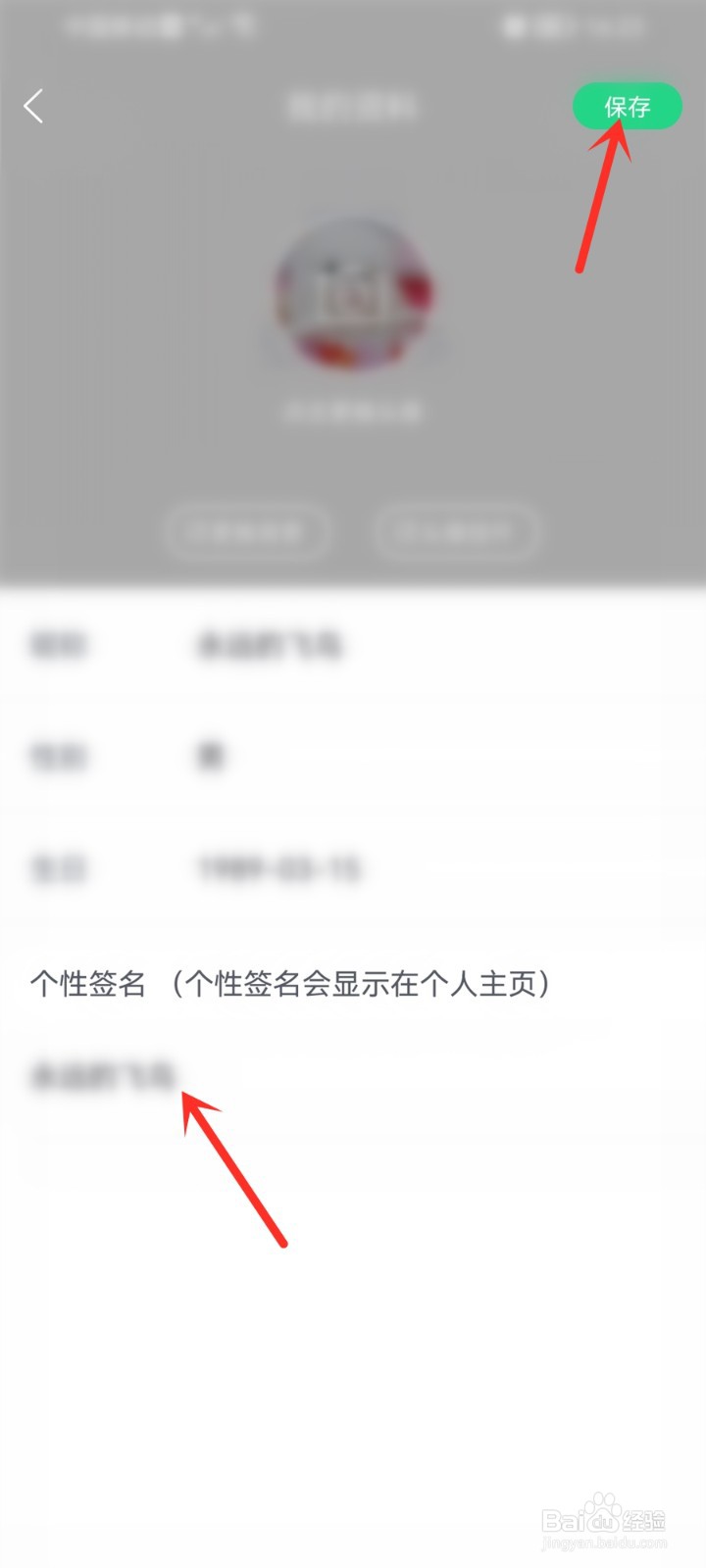 4、进入个人资料页,输入个性签名,点击“保存”图标即可。