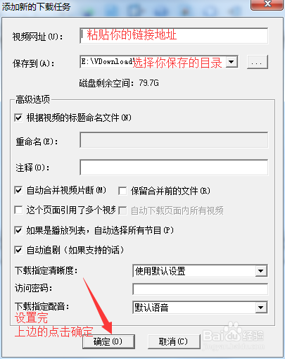 3、粘贴你的地址到视频网址,然后选择你要保存的目录,然后确定