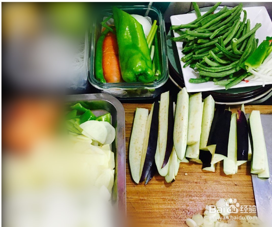 1、茄子切条,豆角保持长段,洗干净,阴干水分。锅内热油,用筷子插着冒泡,就可以将豆角放进去炸。