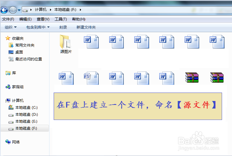 3、实现以上效果的操作,首先在F盘上,建立一个文件夹,命名为【源文件】。