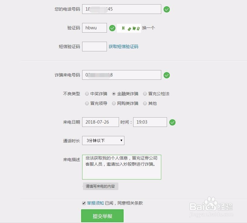 5、进入举报信息填写页面后,我们输入我们的相关信息,然后填写需要举报的电话号码,以及详细的诈骗信息,然后点击提交。