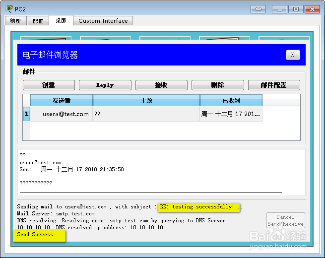 6、检查userb是否接收到邮件。点开PC2的“桌面”选项卡,再单击“电子邮件”,然后,点击“接收”
