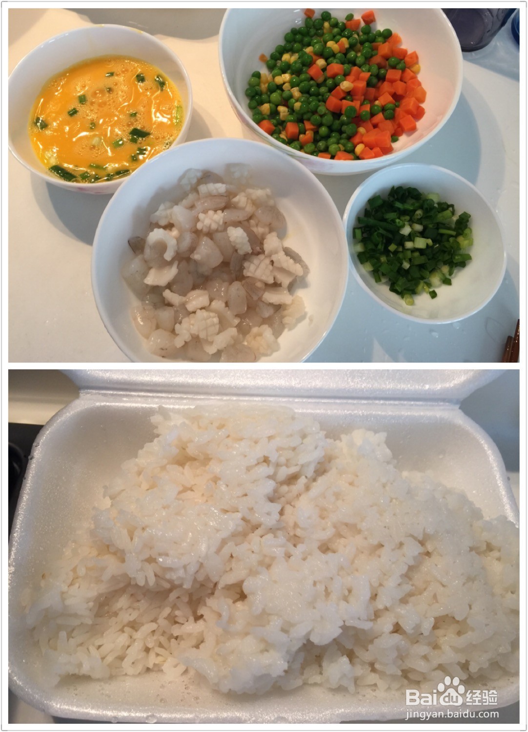 1、食材大合照~小葱切碎、(冷冻)虾仁、鱿鱼解冻切块,鸡蛋搅拌均匀,杂豆备用