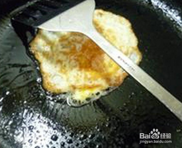 3、取平底锅置火上倒点油烧热,打入鸡蛋两面煎一下。