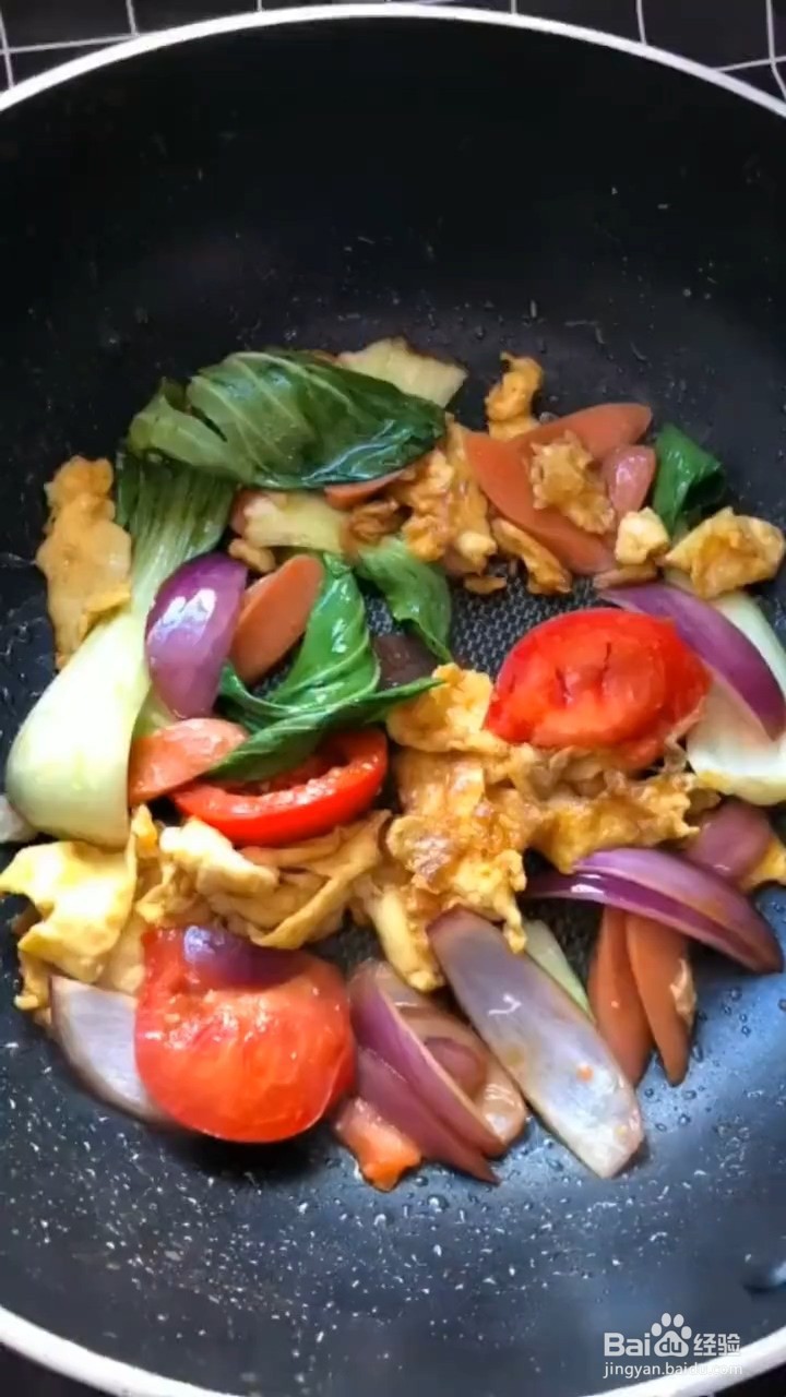 2、再放入配购段菜 生抽 蚝油 翻炒均匀;