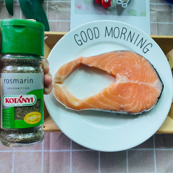 5、三文鱼排两面均匀撒上罗勒碎,腌制30分钟
