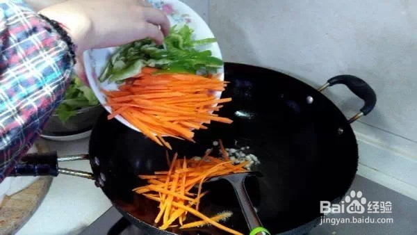 4、待胡萝卜丝、青椒丝油色炒匀后,放入事先备好的杏鲍菇丝改大火翻炒。
