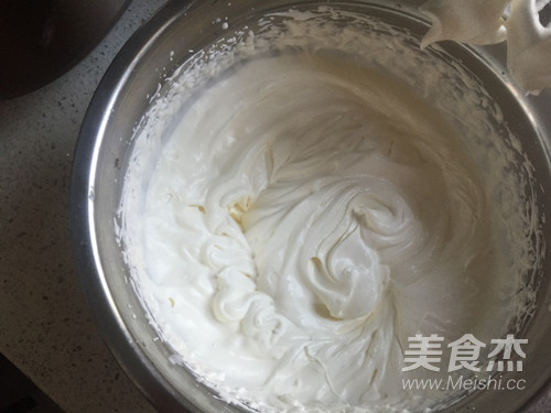 2、400克淡奶油放入40克绵白糖打发至抹面状态。(留一小部分打发至裱花状态,然后装入裱花袋)