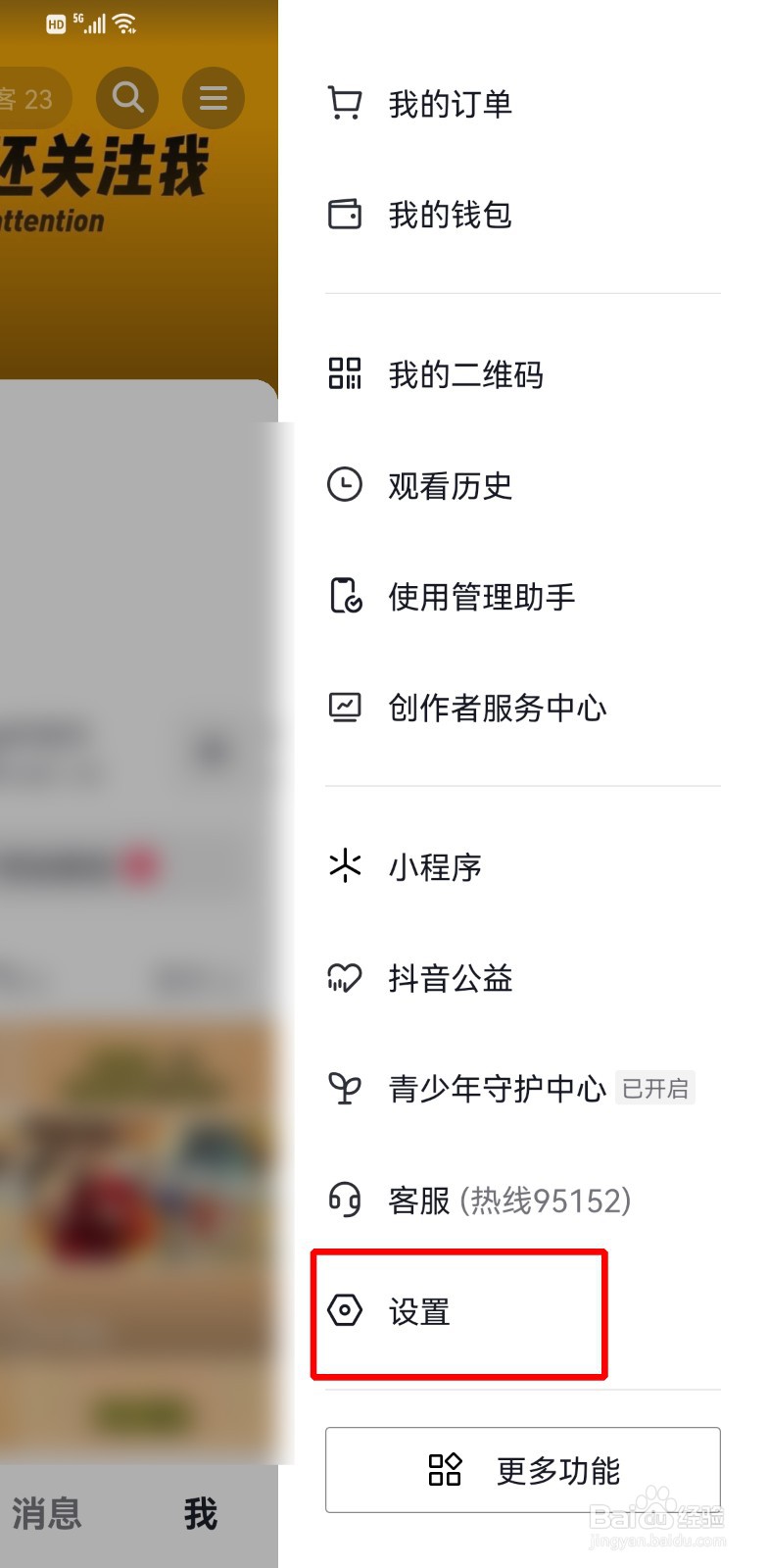 1、进入抖音我页面,点击右上角三横,然后点击设置。