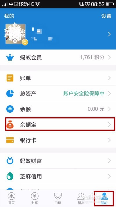 1、 点开支付宝的首页,我们可以看到余额宝,它的利息相对于银行来讲会高一些,除了主页面外在右下角的我里面也可以找到余额宝。