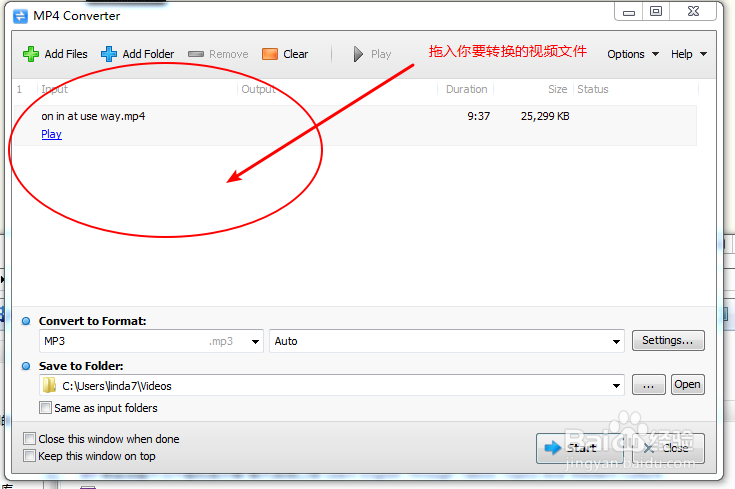 4、现在你看到Mp4 convert的主界面了,这个界面简单清爽。有两个菜单按钮,一个是Add Files是选中文件来加,一个Add Folders是选中文件夹来加。非常方便,文件与文件夹随你选。