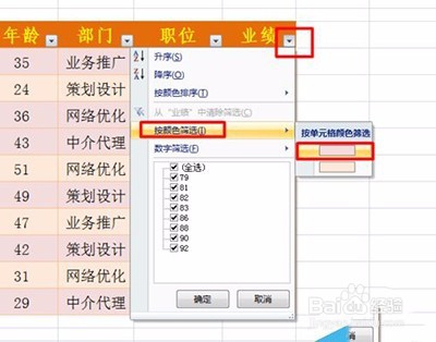6、同时还支持“按颜色筛选”,只需要点击下拉箭头,从中选择“按颜色筛选”,同时选择相应的颜色即可实现筛选功能。当然,实现该步的前提是单位格已被设置了背景色。