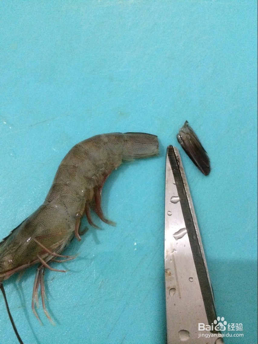 1、买虾最好是活虾,这样吃起来肉质更鲜美、q弹;下面我们来演示2款快速去虾线的方法。首先我们要准备好一把厨房用的剪刀。