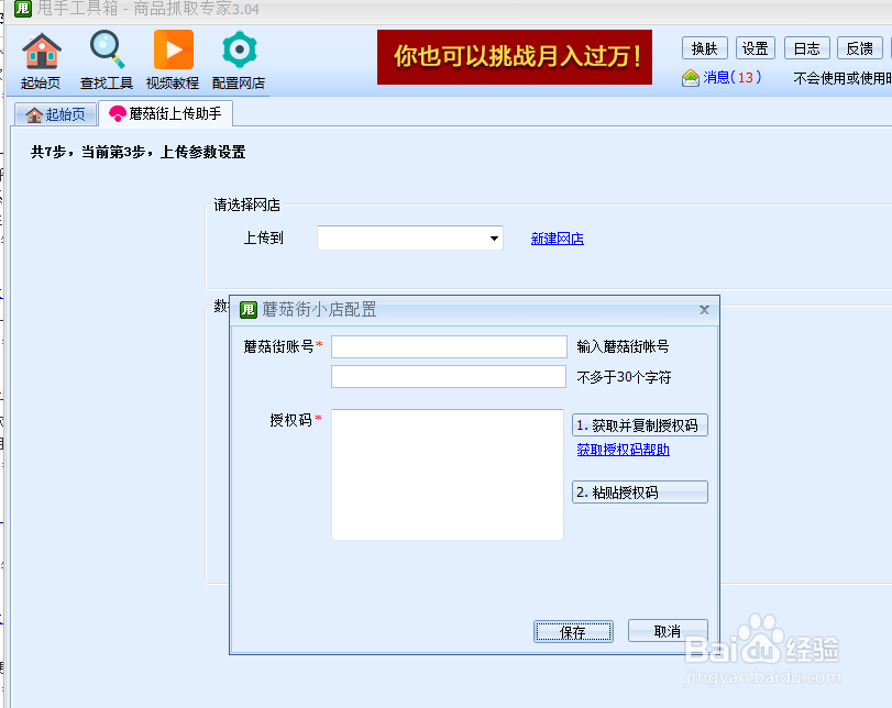 6、如图所示:要上传商品到蘑菇街要先配置店铺。