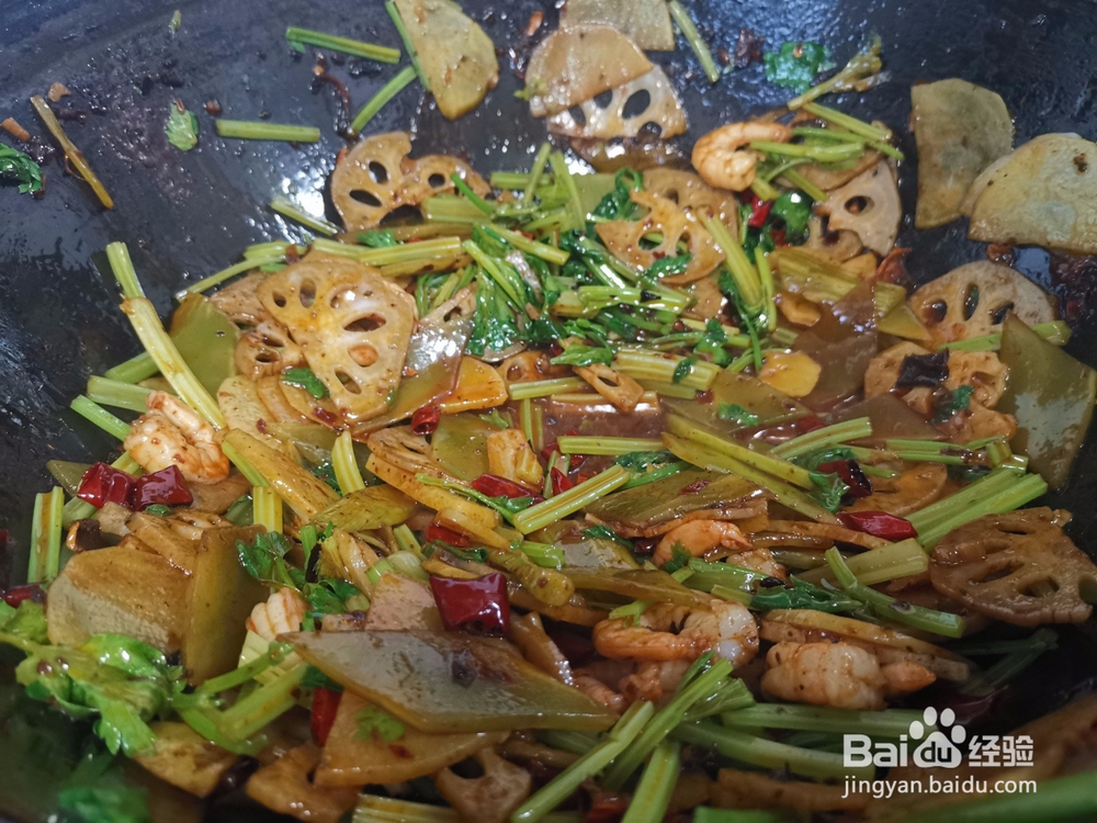 4、再下入虾仁和芹菜段,翻炒均匀,添加调味品盐和十三香调味