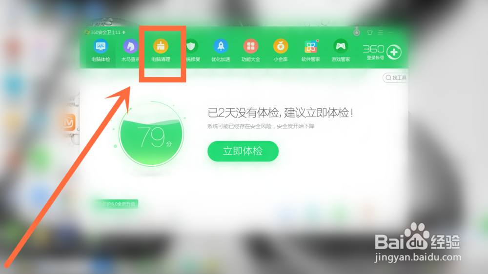 2、进入360安全卫士界面后,点击下上方的电脑清理进入。如下图所示