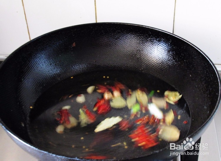 4、另起锅加油烧热后放入辣椒,胡椒翻炒出香味