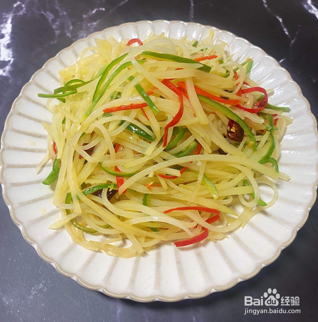 1、准备一个土豆去皮 先切薄片再切丝 尽量切薄切细丝 再把切好的土豆丝用清水冲洗 把土豆粉洗干净(这样炒时不沾锅)