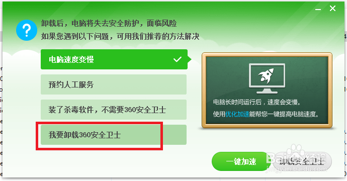 3、 到了退出安全卫士这一步的时候,我猜你可能是找不到你的电脑优化记录了,这里我们可以直接进行卸载这个安全卫士,随后在重新装一下即可
