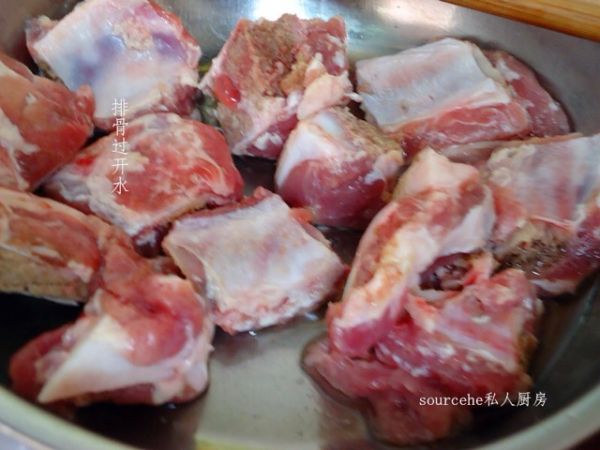 12、放排骨,煎,等排骨和焦糖煎到微黄;